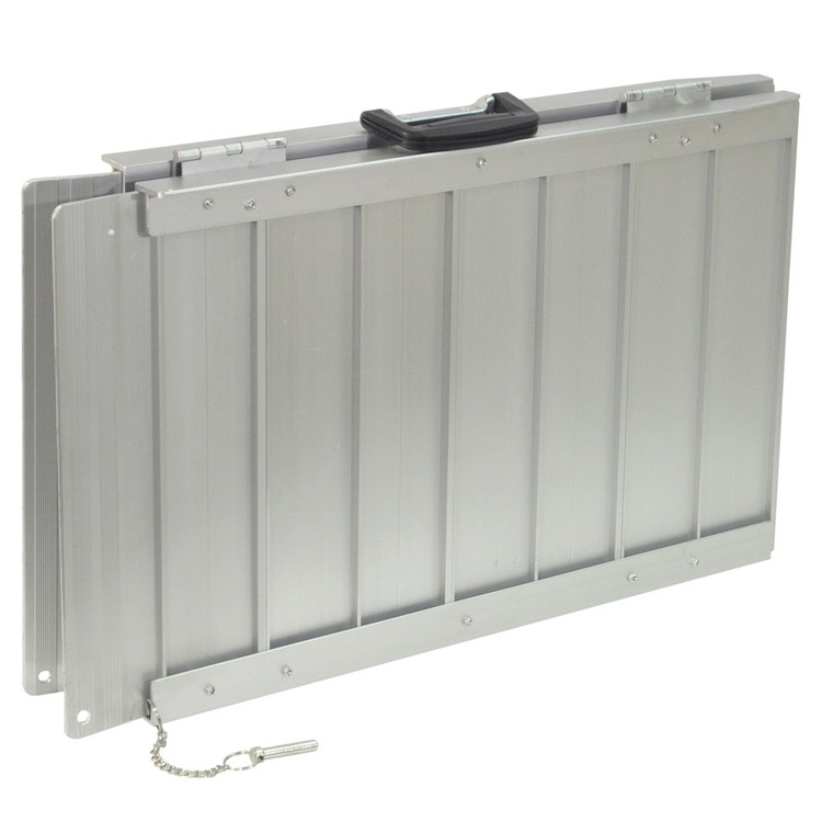 The folding, suitcase type ramp is constructed from lightweight, rust-free aluminium and has milled safety treads on the surface, raised side walls and security locks, making the unit extremely portable and convenient to store.