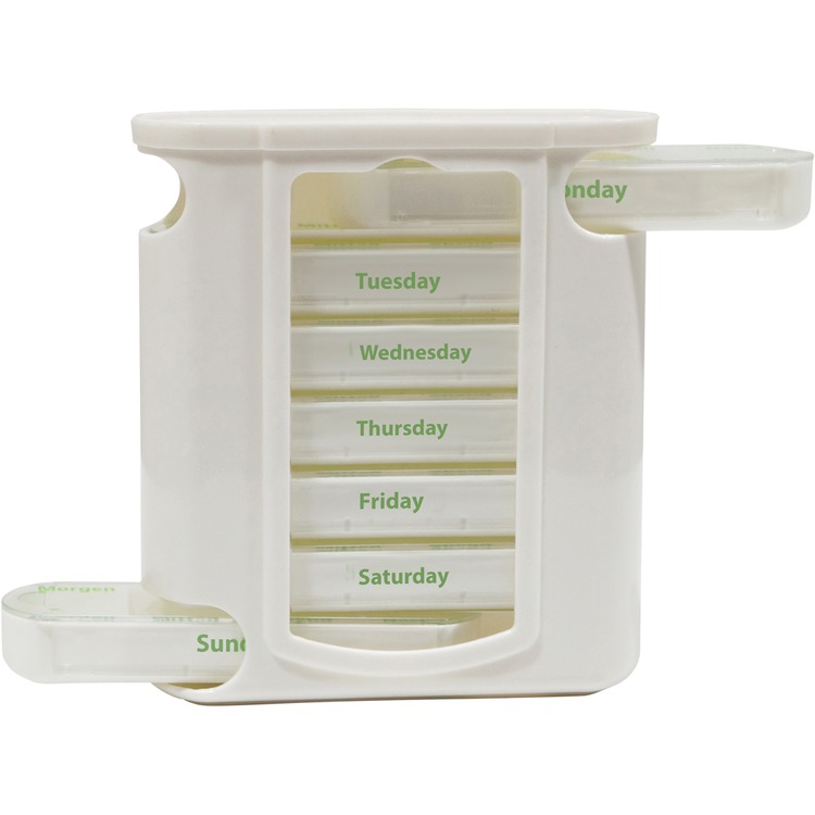 The Weekday Pill Dispenser is ideal for people who are required to take a number of pills throughout the day. It has seven, clearly labelled individual removable compartments for each day of the week, with each day having four compartments: morning, noon, evening, and night.