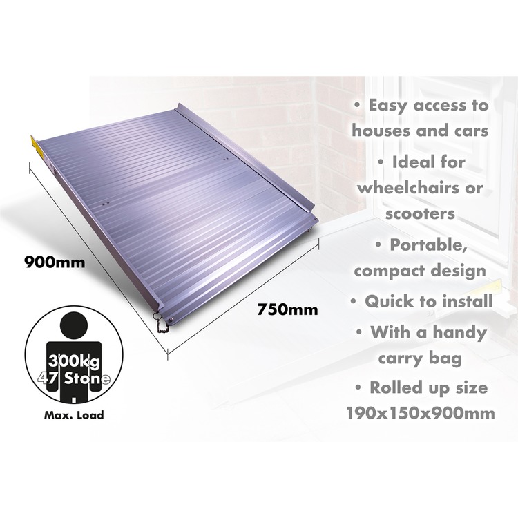This compact roll up aluminium ramp allows wheelchair, mobility scooter and rollator users safe and stable access to homes, cars and gardens.
