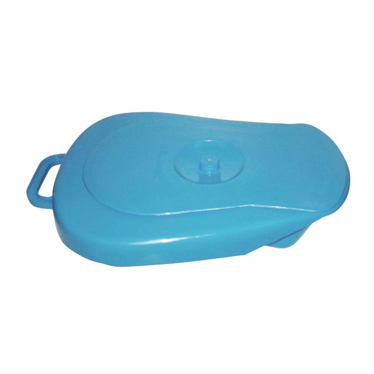 This robust, plastic Bedpan features a fitted lid and integrated handle for easily transporting and cleaning the bedpan.