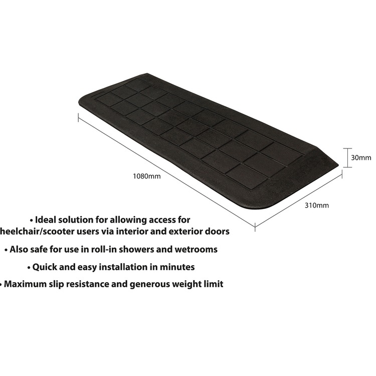 This 30 x 1080 x 310 mm (Height x Width x Depth) ramp is ideal for interior and exterior doors or thresholds, but are also safe for use in roll-in showers, wet rooms and any other application requiring vertical transition.
