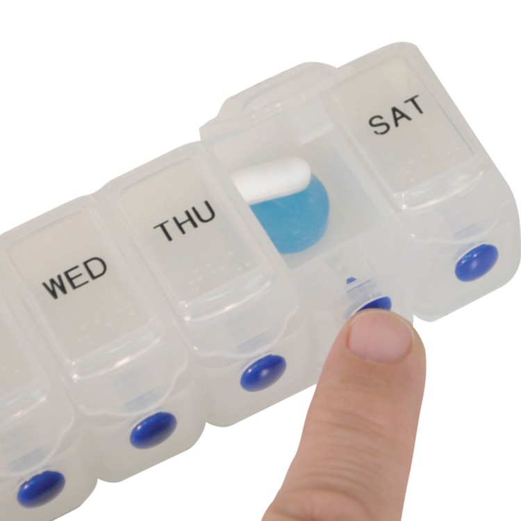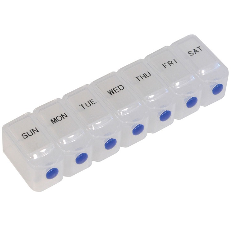 This deluxe weekday pill dispenser is the perfect way to make sure you never miss your medication. Each compartment has the day printed in braille and is easy to open with the push button release.